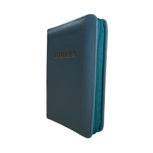 Biblie din piele,marime mica, culoare gri albastrui, fermoar, margini albe, cuv. lui Isus in rosu [043 PF]