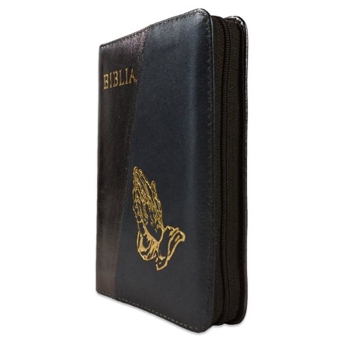 Biblie din piele,marime mica, culoare kaki cu gri sidefat, fermoar, margini albe, simbolul maini in rugaciune, cuv. lui Isus in rosu [043 PF]