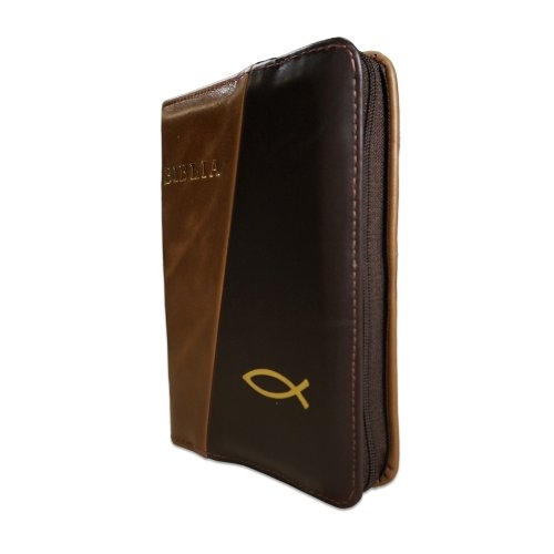 Biblie din piele, marime mica, culoare maro deschis cu brun, fermoar, margini albe,simbol peste, cuv. lui Isus in rosu [043 PF]
