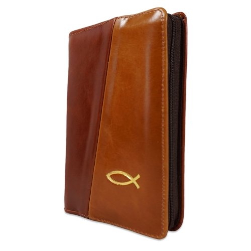 Biblie din piele, marime mica, culoare maro roscat cu maro deschis, fermoar, margini albe, simbol peste, cuv. lui Isus in rosu [043 PF]
