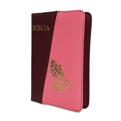 Biblie din piele,marime mica, culoare visiniu inchis cu roz, fermoar, margini albe, simbolul maini in rugaciune, cuv. lui Isus in rosu [043 PF]