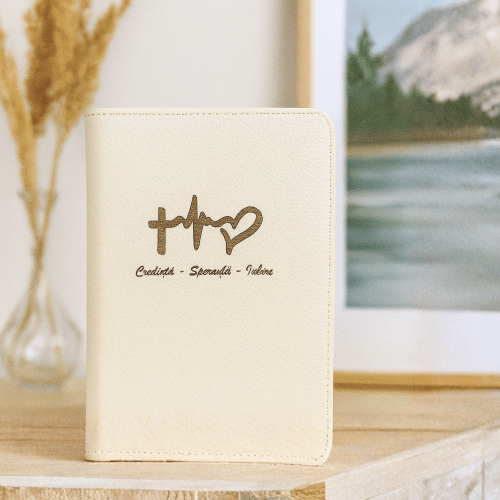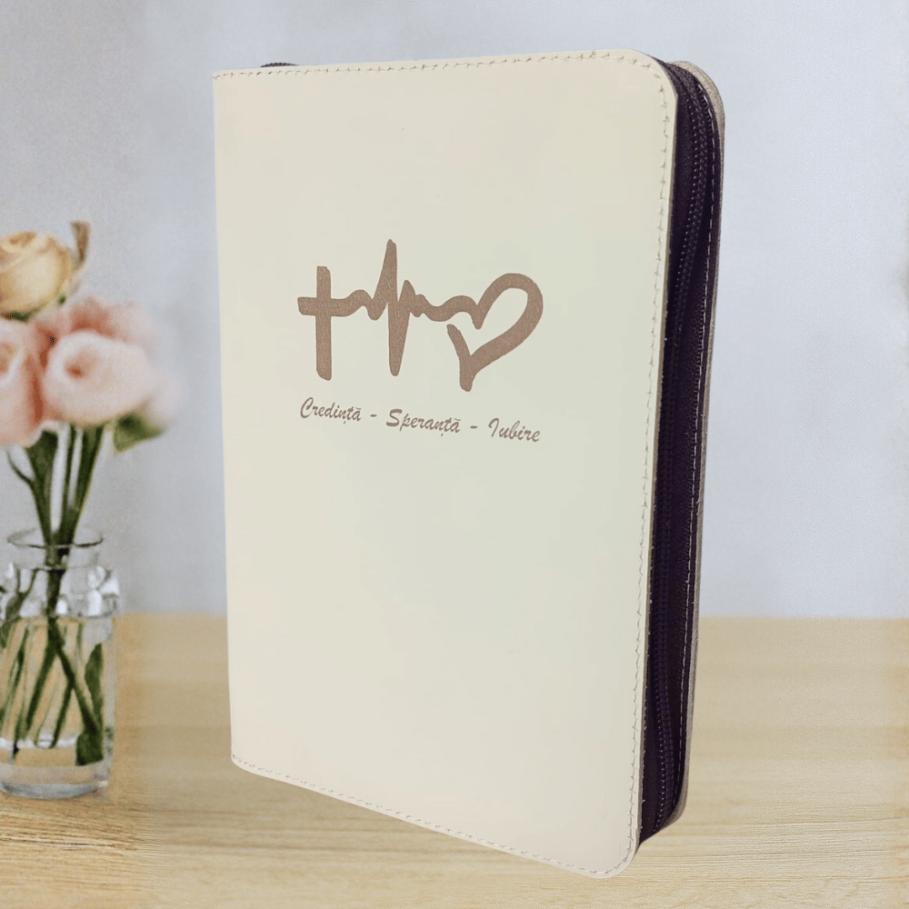 Biblie din piele, medie, crem deschis, simbol credinta, fermoar, index, margini aurii, cuv. lui Isus cu rosu [057 PFI]