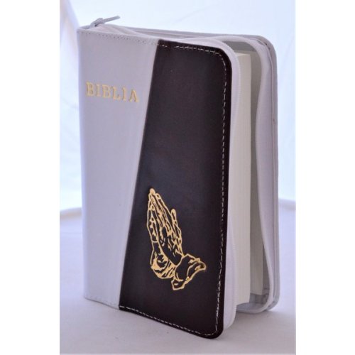 Biblie din piele, mica, alb/maro inchis , fermoar, margini albe, simbolul maini in ruga, cuv. lui Isus in rosu [043 PF]