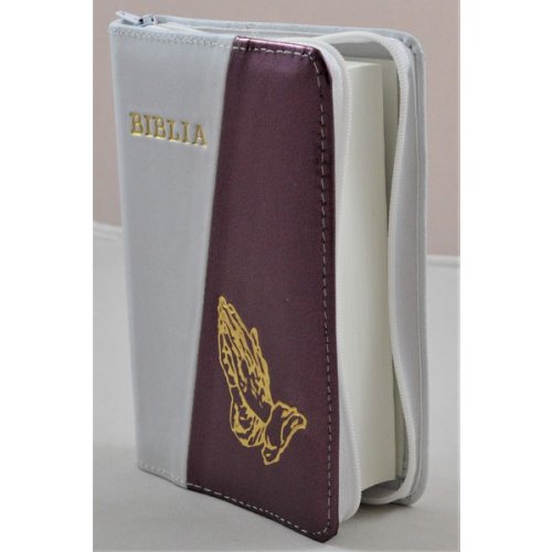 Biblie din piele, mica, alb/mov sidefat, fermoar, margini albe, simbolul maini in ruga, cuv. lui Isus in rosu [043 PF]