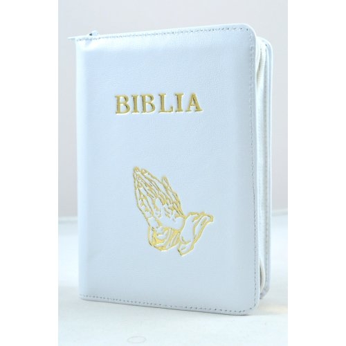 Biblie din piele, mica, alba, fermoar, aurita, cu maini, cuv. lui Isus in rosu [043 A]
