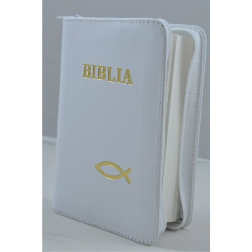 Biblie din piele, mica, alba, fermoar, margini albe,simbol maini in ruga, cuv. lui Isus in rosu [043 PF]