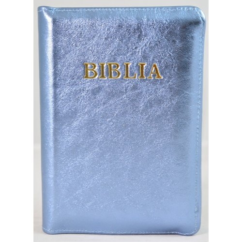 Biblie din piele, mica, albastru metalic sidefat, fermoar, margini albe, cuv. lui Isus in rosu [043 PF]