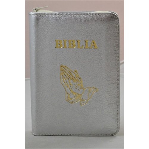 Biblie din piele, mica, argintiu, fermoar, margini albe, simbolul maini in ruga, cuv. lui Isus in rosu [043 PF]