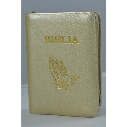 Biblie din piele, mica, culoare aurie, fermoar, margini albe,simbol maini in ruga, cuv. lui Isus in rosu [043 PF]