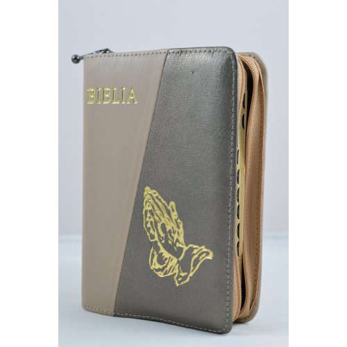 Biblie din piele, mica,bej cu gri sidefat si cu maini, fermoar, aurita, cuv. lui Isus in rosu si index [047 pfi]