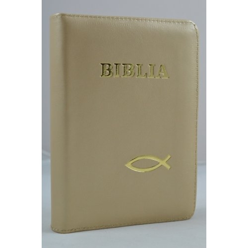 Biblie din piele, mica,bej deschis cu peste, fermoar, aurita, cuv. lui Isus in rosu [043 A]