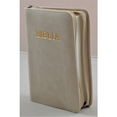 Biblie din piele, mica, bej, fermoar, margini albe, cuv. lui Isus in rosu [043 PF]