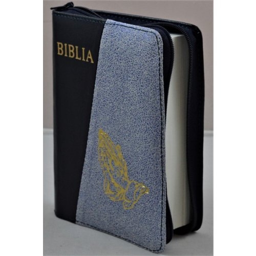Biblie din piele, mica, bleumaren/alb cu albastru metalizat, fermoar, margini albe, simbolul maini in ruga, cuv. lui Isus in rosu [043 PF]