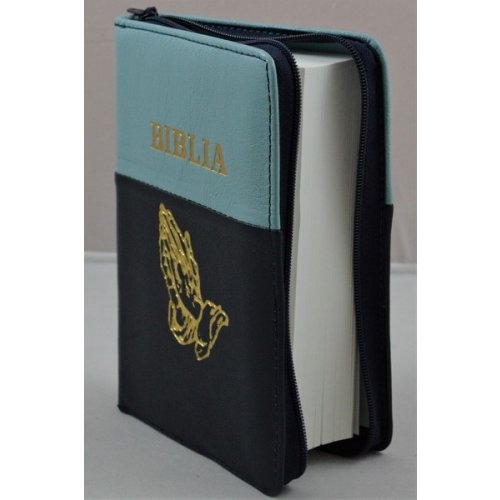 Biblie din piele, mica, bleumaren/albastru , fermoar, margini albe, simbolul peste, cuv. lui Isus in rosu [043 PF]