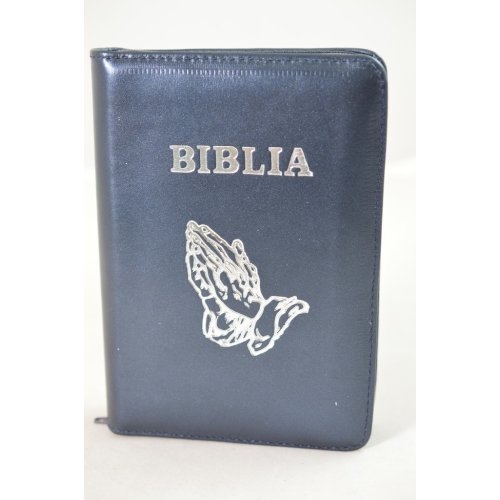 Biblie din piele, mica, bleumarin inchis sidefat, fermoar, margini argintii, simbolul maini in ruga, cuv. lui Isus in rosu [043 PF]