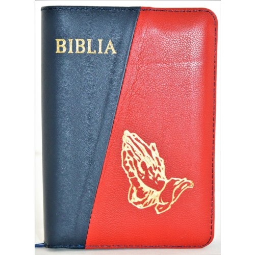 Biblie din piele, mica, bleumarin / rosie, fermoar, margini albe, simbolul maini in ruga, cuv. lui Isus in rosu [043 PF]