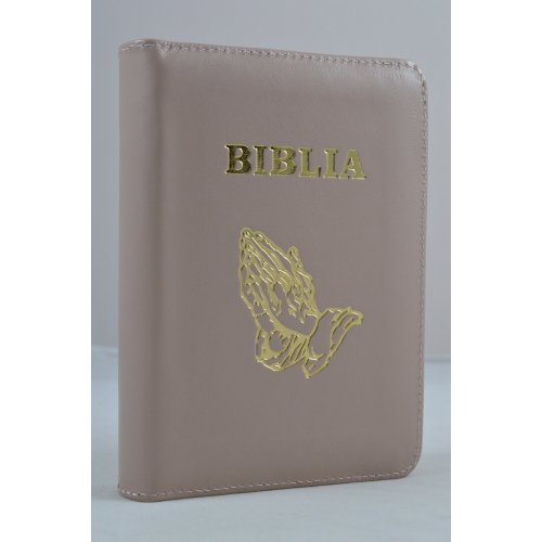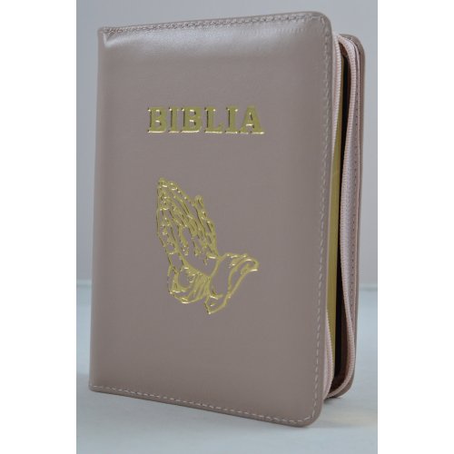 Biblie din piele, mica,cafeniu-roz cu maini, fermoar, aurita, cuv. lui Isus in rosu [043 A]