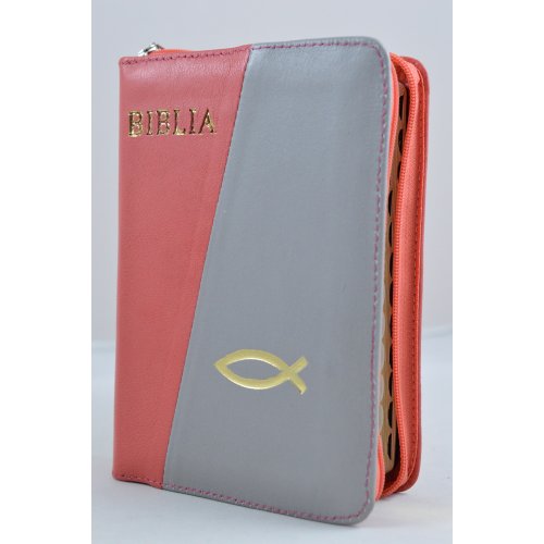 Biblie din piele, mica,coral cu gri si cu peste, fermoar, aurita, cuv. lui Isus in rosu si index[047 pfi]