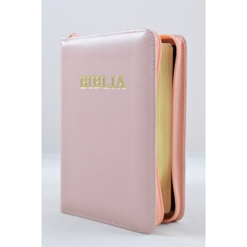 Biblie din piele, mica,crem-roz pal, fermoar, aurita, cuv. lui Isus in rosu [043 A]