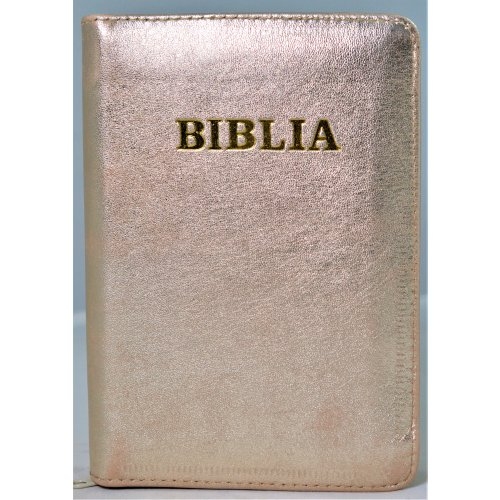 Biblie din piele, mica, culoare auriu sidefat, fermoar, margini albe, cuv. lui Isus in rosu [043 PF]