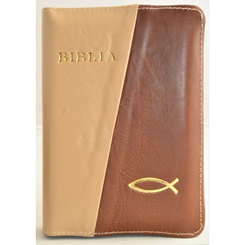 Biblie din piele, mica, culoare bej / maro, fermoar, margini albe, simbolul peste, cuv. lui Isus in rosu [043 PF]