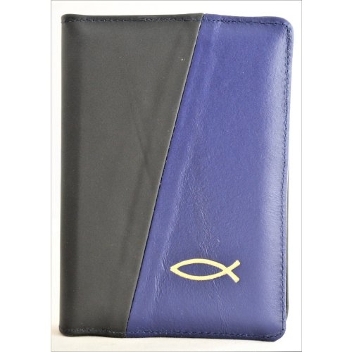 Biblie din piele, mica, culoare negru / albastru indigo, fermoar, margini albe, simbolul peste, cuv. lui Isus in rosu [043 PF]