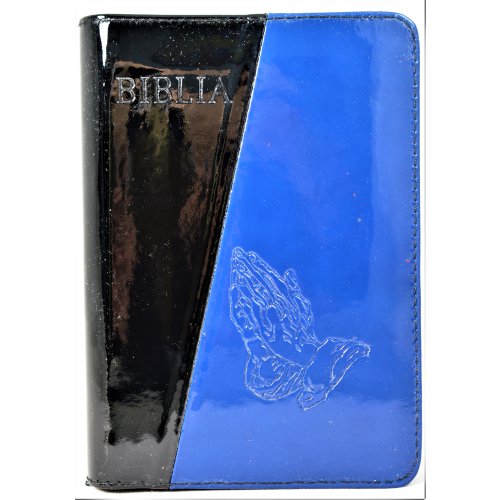 Biblie din piele, mica, culoare negru lacuit/bleumarin lacuit, fermoar, margini albe, simbolul maini in ruga, cuv. lui Isus in rosu [043 PF]