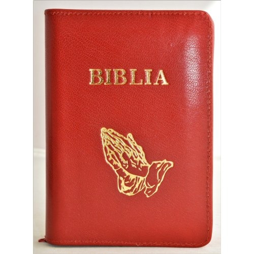 Biblie din piele, mica, culoare rosie, fermoar, margini albe, simbolul maini in ruga, cuv. lui Isus in rosu [043 PF]