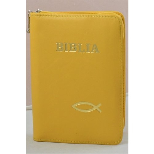 Biblie din piele, mica, galbena, fermoar, margini albe, simbolul peste, cuv. lui Isus in rosu [043 PF]