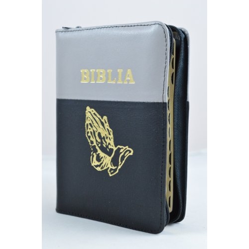Biblie din piele, mica,gri cu negru si cu maini, fermoar, aurita, cuv. lui Isus in rosu si index[047 pfi]