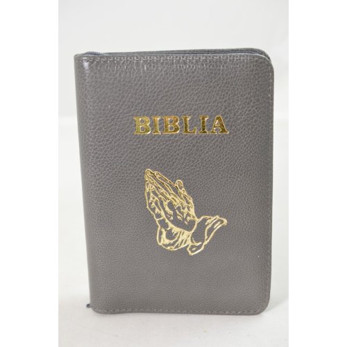 Biblie din piele, mica, gri, fermoar, margini albe, simbolul maini in ruga, cuv. lui Isus in rosu [043 PF]