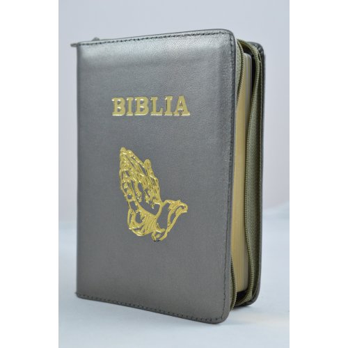 Biblie din piele, mica,gri sidefat cu maini, fermoar, aurita, cuv. lui Isus in rosu [043 A]
