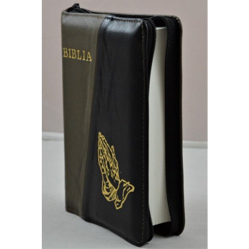 Biblie din piele, mica, kaki/negru, fermoar, margini albe, simbolul maini in ruga, cuv. lui Isus in rosu [043 PF]