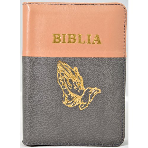 Biblie din piele, mica, maro cu gri, fermoar, margini albe,simbol maini in ruga, cuv. lui Isus in rosu [043 PF]