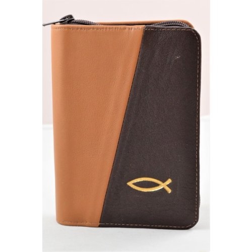 Biblie din piele, mica, maro/maro inchis, fermoar, margini albe, simbolul peste, cuv. lui Isus in rosu [043 PF]