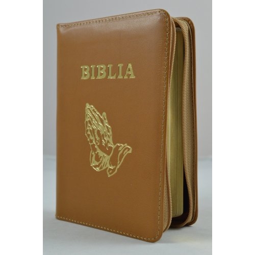 Biblie din piele, mica,maro deschis cu maini, fermoar, aurita, cuv. lui Isus in rosu [043 A]