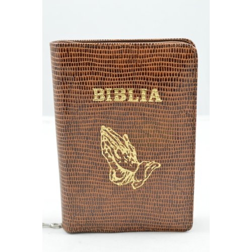 Biblie din piele, mica, maro texturat, fermoar, margini albe, simbolul maini in ruga, cuv. lui Isus in rosu [043 PF]