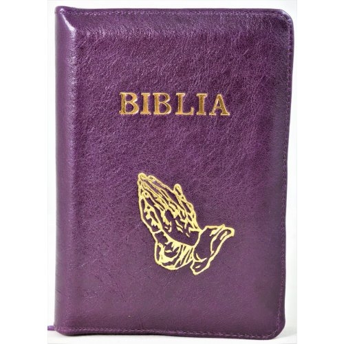 Biblie din piele, mica, mov inchis, fermoar, margini albe, simbolul maini in ruga, cuv. lui Isus in rosu [043 PF]