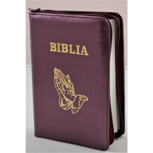 Biblie din piele, mica, mov sidefat, fermoar, margini albe, simbolul maini in ruga, cuv. lui Isus in rosu [043 PF]