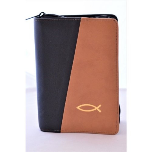 Biblie din piele, mica, negru/maro deschis, fermoar, margini albe, simbolul peste, cuv. lui Isus in rosu [043 PF]