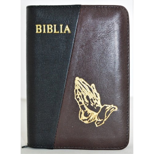 Biblie din piele, mica, negru / maro , fermoar, margini albe, simbolul maini in ruga, cuv. lui Isus in rosu [043 PF]