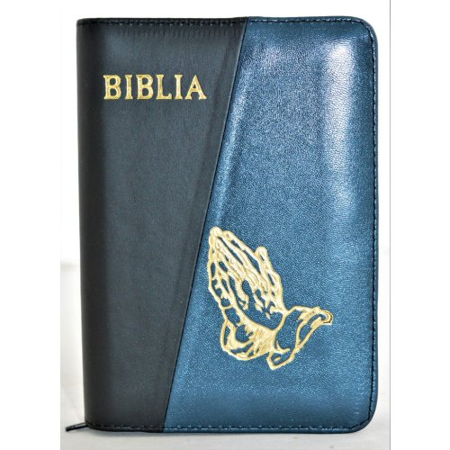 Biblie din piele, mica, negru / nuanta albastru, fermoar, margini albe, simbolul maini in ruga, cuv. lui Isus in rosu [043 PF]