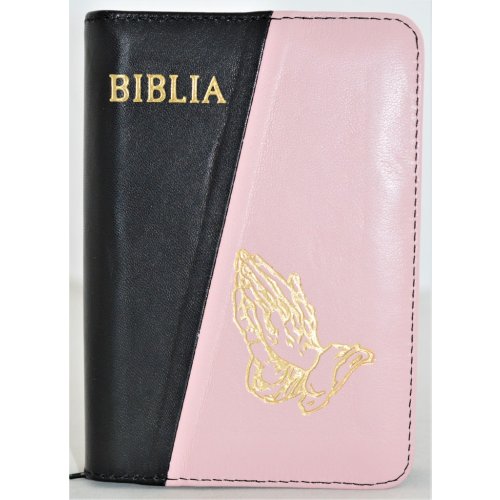 Biblie din piele, mica, negru / nuanta roz , fermoar, margini albe, simbolul maini in ruga, cuv. lui Isus in rosu [043 PF]