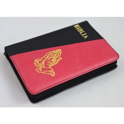 Biblie din piele, mica, negru / roz inchis, fermoar, cu maini, cuv. lui Isus in rosu [043 A]