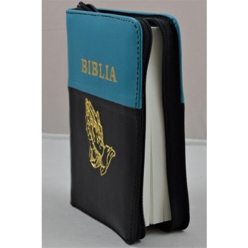 Biblie din piele, mica, negru/turcoaz, fermoar, margini albe, simbolul maini in ruga, cuv. lui Isus in rosu [043 PF]