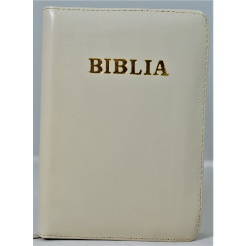 Biblie din piele, mica, nuanta crem, fermoar, margini albe, cuv. lui Isus in rosu [043 PF]