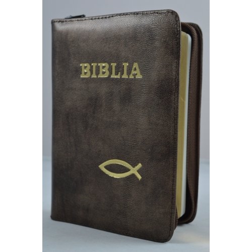 Biblie din piele, mica,nuante de maro cu peste, fermoar, aurita, cuv. lui Isus in rosu [043 A]
