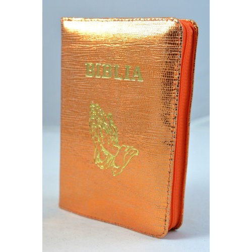 Biblie din piele, mica, portocaliu sidefat, fermoar, cuv. lui Isus in rosu, simbol maini in ruga [043 A]