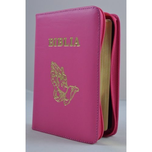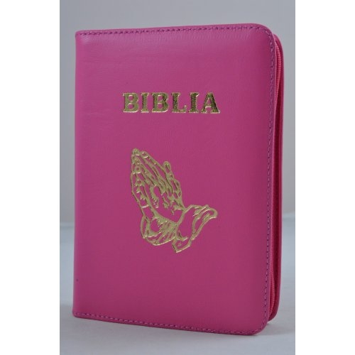 Biblie din piele, mica,roz bombon cu maini, fermoar, cuv. lui Isus in rosu [043 A]