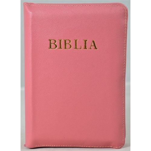 Biblie din piele, mica, roz capucin, fermoar, margini albe, cuv. lui Isus in rosu [043 PF]